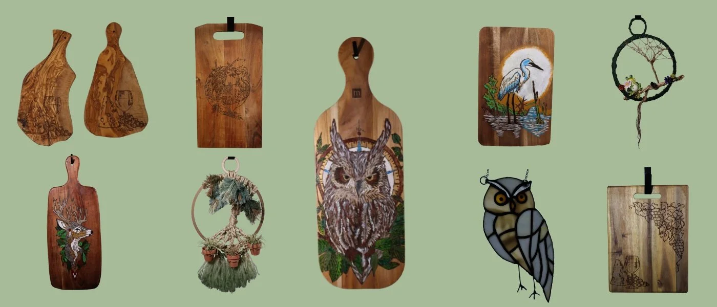 Tommy and Jamie Stott have decades of crafting custom art-pieces, including but not limited to: decorative wooden cutting boards, hanging macrame pieces, stained-glass artwork, rocking horses and treasure chests.